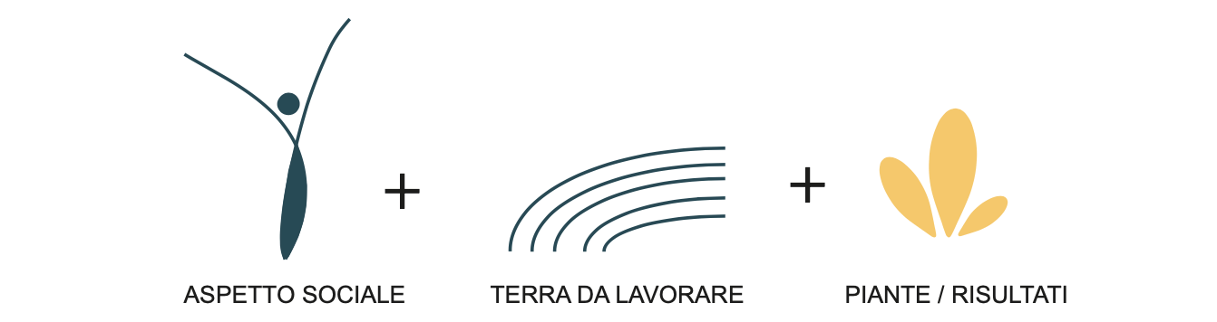 Abbiamo rappresentato l’aspetto sociale attraverso figure umane stilizzate ed in movimento, mentre l’aspetto agricolo è rappresentato dai solchi bianchi che simboleggiano la terra da lavorare e dal giallo delle foglie delle piante, simbolo dei risultati del progetto.